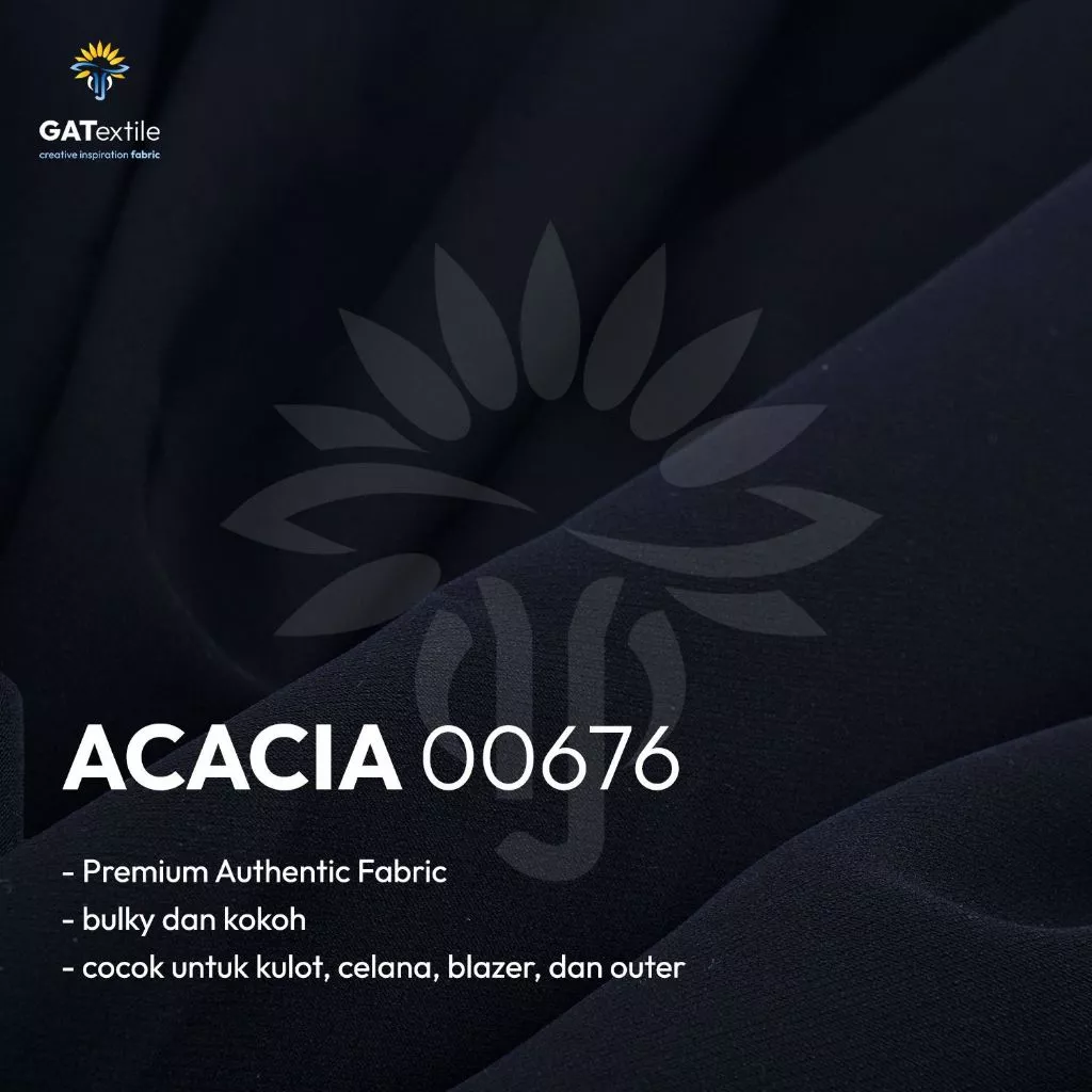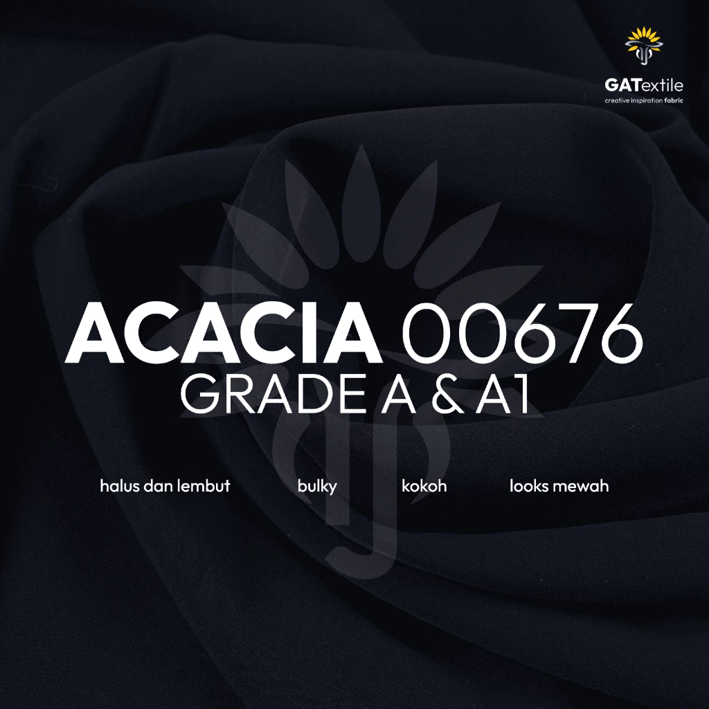 Kain Acacia terbuat dari bahan polyester dengan tekstur halus namun tetap kokoh. Karakteristik crepe pada kain ini memberi kesan elegan sekaligus nyaman dipakai.