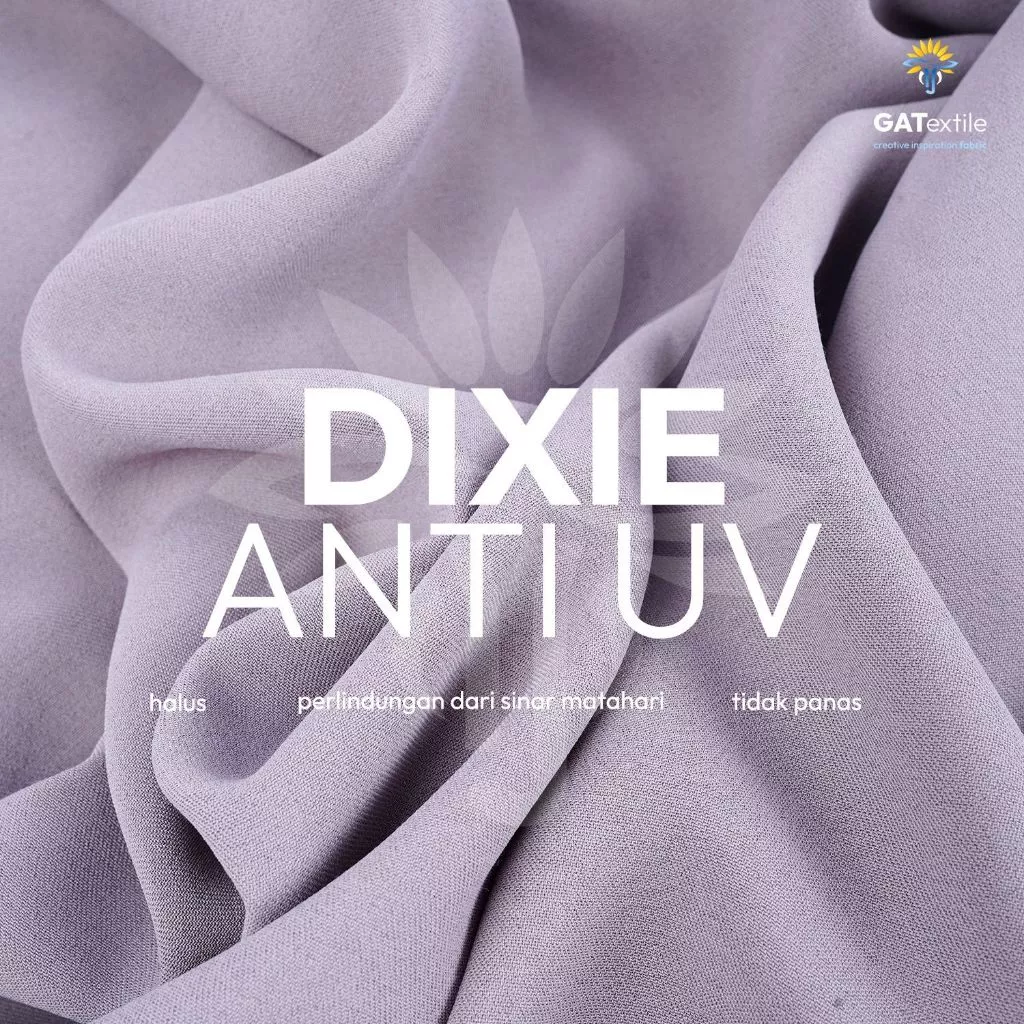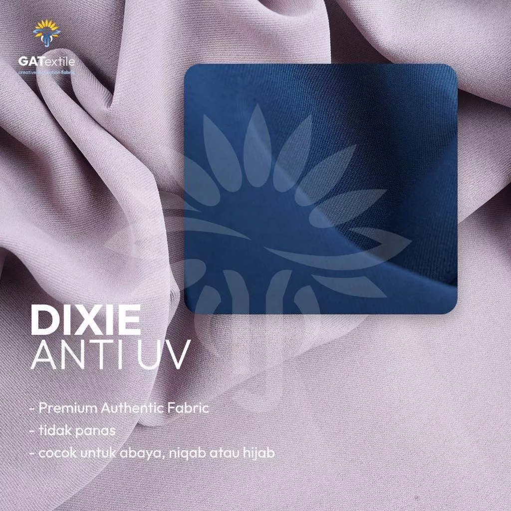 Dixie Anti UV merupakan kain berkualitas tinggi yang ideal untuk pembuatan set abaya, niqab, maupun hijab dengan kebutuhan kain lebih dari 3 meter. Teksturnya halus, flowy, dan tidak panas, sehingga memberikan kenyamanan optimal bahkan saat dipakai di cuaca panas. Keunggulan utamanya terletak pada fitur anti UV yang memberikan perlindungan dari paparan sinar matahari langsung. Selain itu, warnanya awet dan tidak mudah luntur, menjaga tampilan pakaian tetap elegan meski sering digunakan.