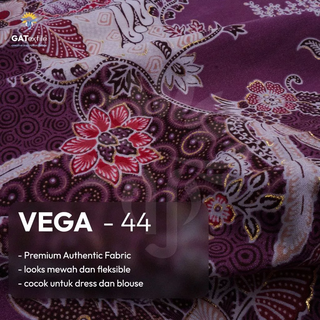 Kain Vega – 44 adalah kain berkualitas tinggi dengan tekstur lembut, ringan, dan mengandung foil yang memberikan efek mewah serta elegan. Bahannya fleksibel dan jatuh dengan indah, sangat cocok digunakan untuk pembuatan dress maupun blouse.